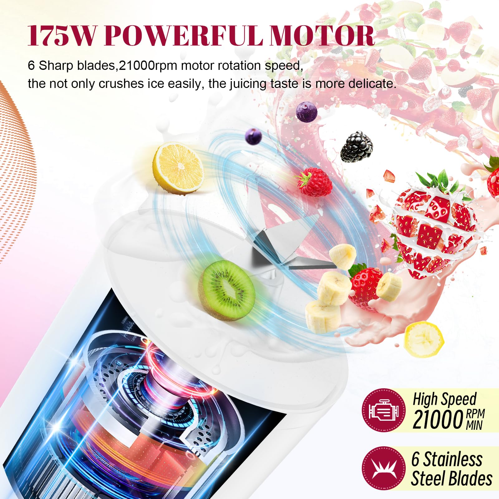 - One-touch Powerful Start: Despite its small size, our personal blender boasts 175W and 21000RPM powerful high-speed technology, providing enough blending power to meet your daily needs in just 30 seconds. Perfect for making nutritious and healthy smoothies, ice drinks, and margaritas, it is ideal for home, office, travel, dormitory, and apartment use.